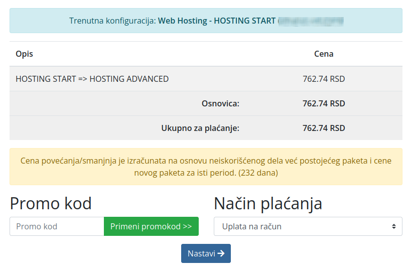 Kada imate zakupljen hosting paket kod nas, u svakom trenutku možete da pređete na veći paket bez prestanka u radu hostinga. Preko vašeg korisničkog panela možete zahtevati promenu paketa. Sistem automatski generiše predračun i šalje na Vaš email. Cena se obračunava za preostali period do isteka paketa. To možete uraditi na sledeći način: