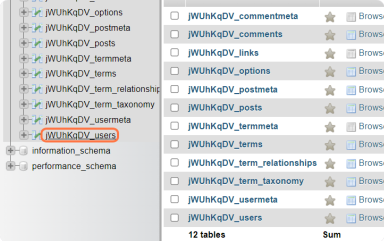 - Find the table named "tablename_users" where "tablename" represents the name of your table, in our example it is "jWUhKqDV_users" and click on it